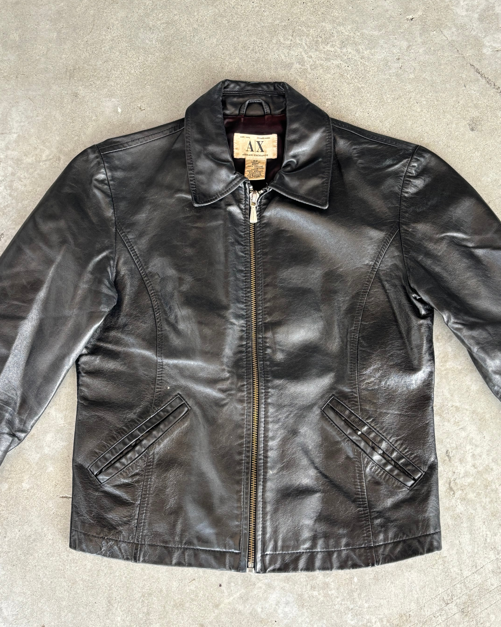 Vintage Armani exchange Semi Cropped leather jacket. Genuine leather with Zip front and collar. Silk lining.