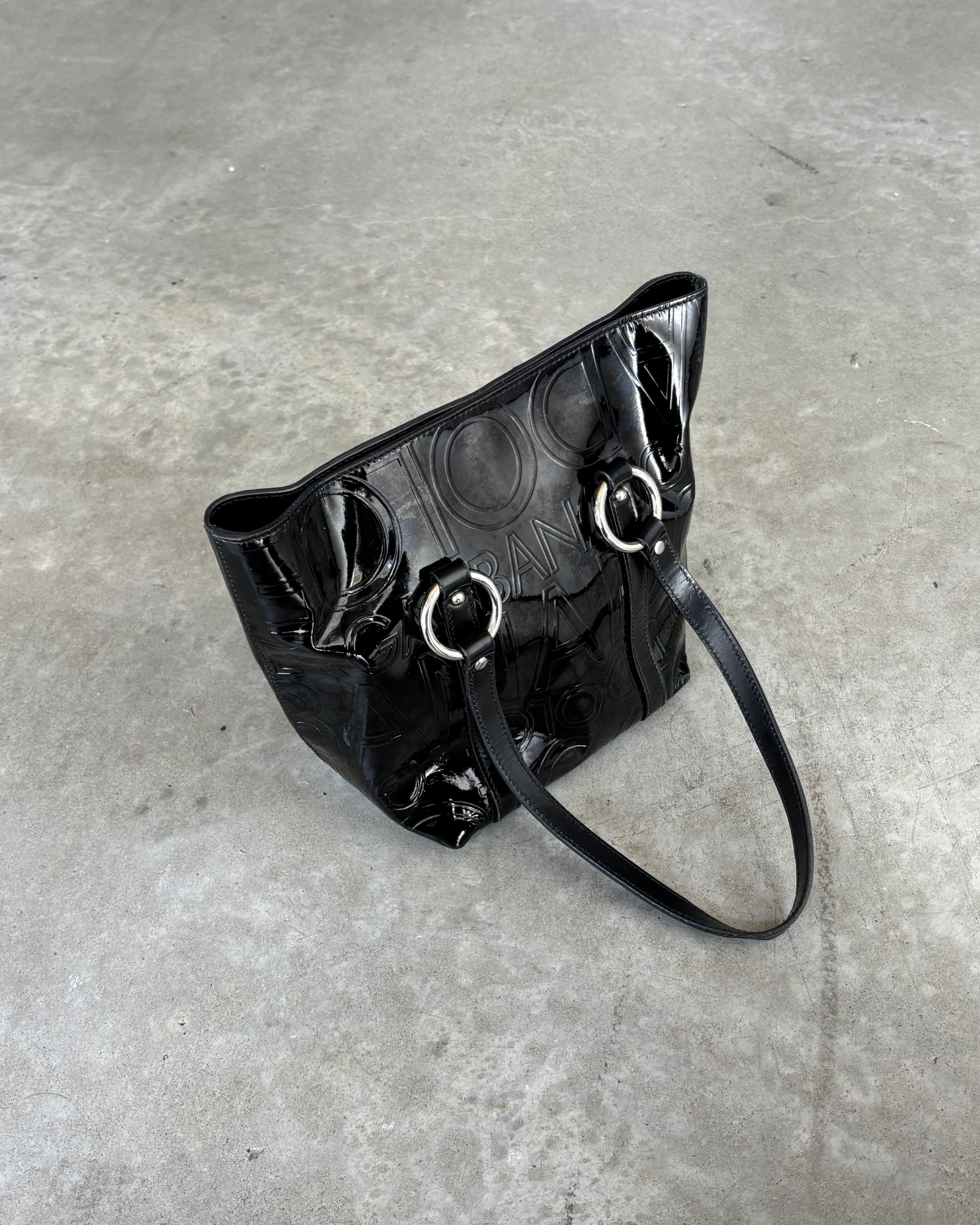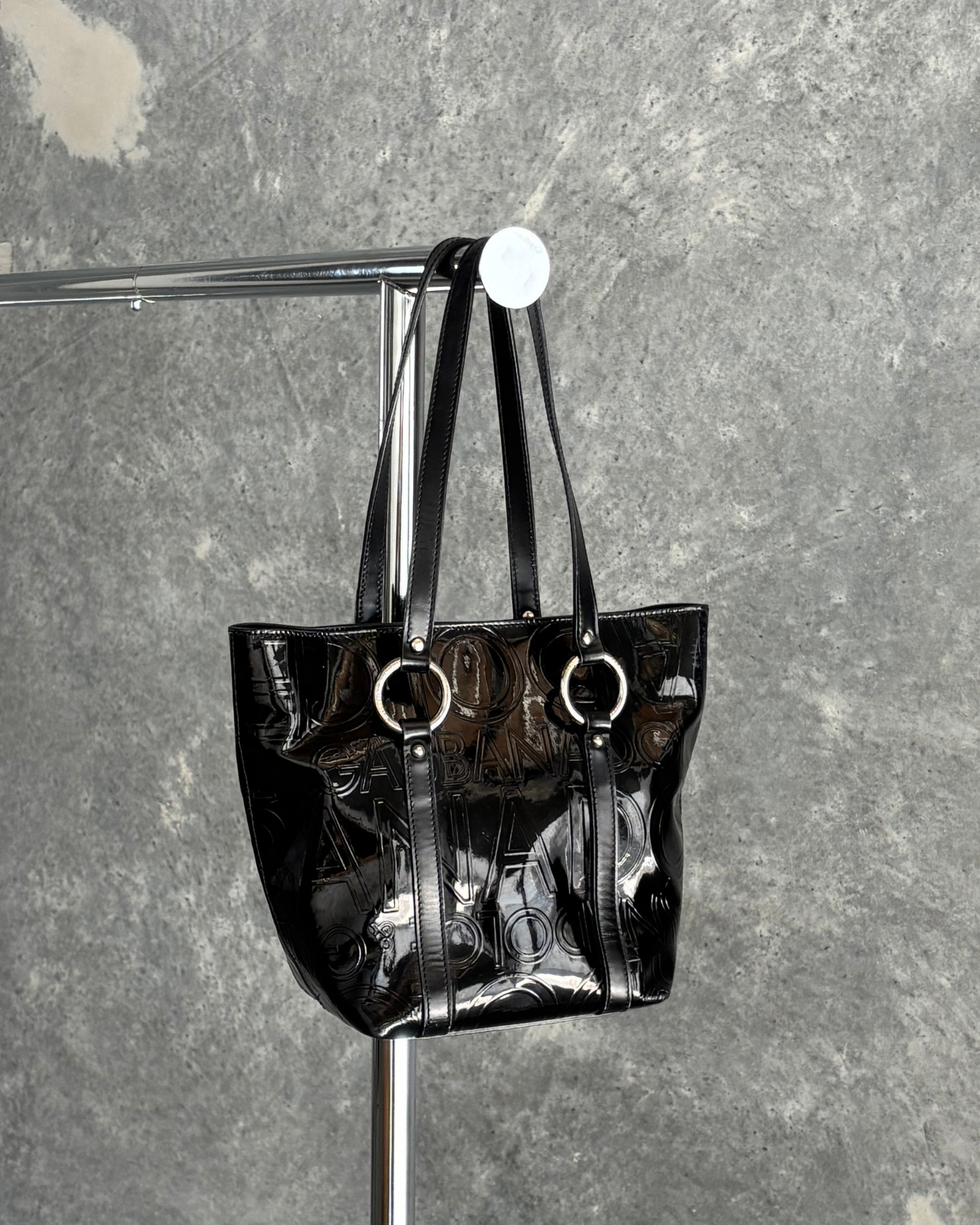 Vintage Dolce & Gabbana black patent leather tote bag featuring embossed logo lettering, two top handles with silver ring details, and an open top clasp design. Fits comfortably under the shoulder.