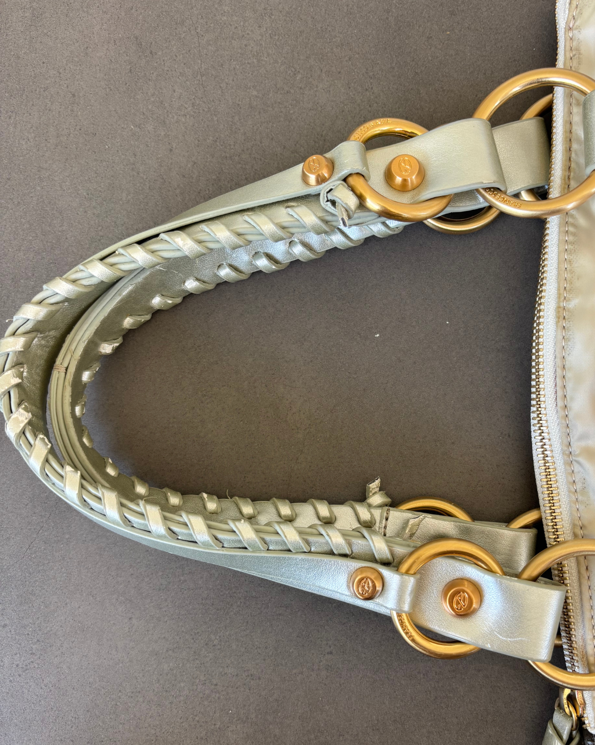 Vintage Francesco Biasia metallic bag with lace up handles. Features two tones metallic and gold hardware. Comes with original dust bag.